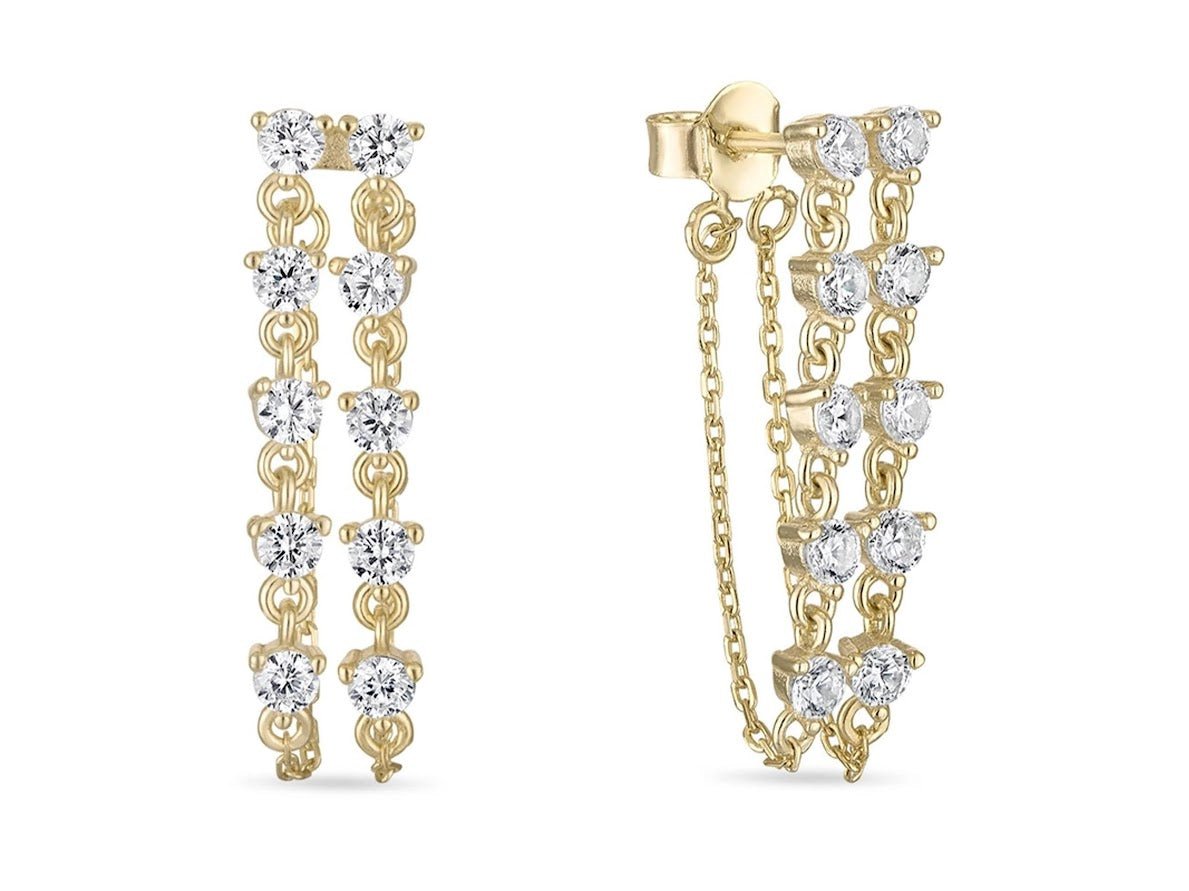 These 14k gold vermeil earrings feature two rows of chain drops, each detailed with cubic zirconia. 1 inch long. Nickel-free and hypoallergenic.