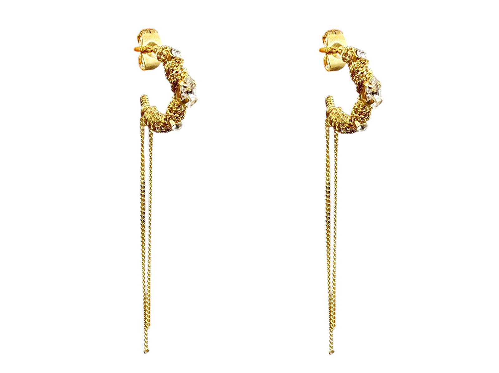 Fine woven brass chains are gilded with 24k gold and wrapped around around hoop earrings with cubic zirconia stones. Handmade in a workshop near Lyon, France.