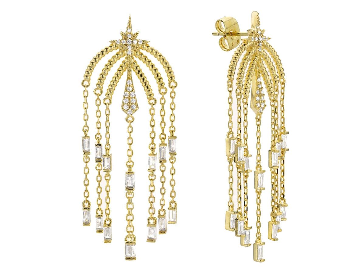 From Belgium: Made of 18k gold-plated brass, plated again with 24k gold, these chandelier earrings are detailed with round and baguette cubic zirconia. Posts are gold vermeil. 56mm long.