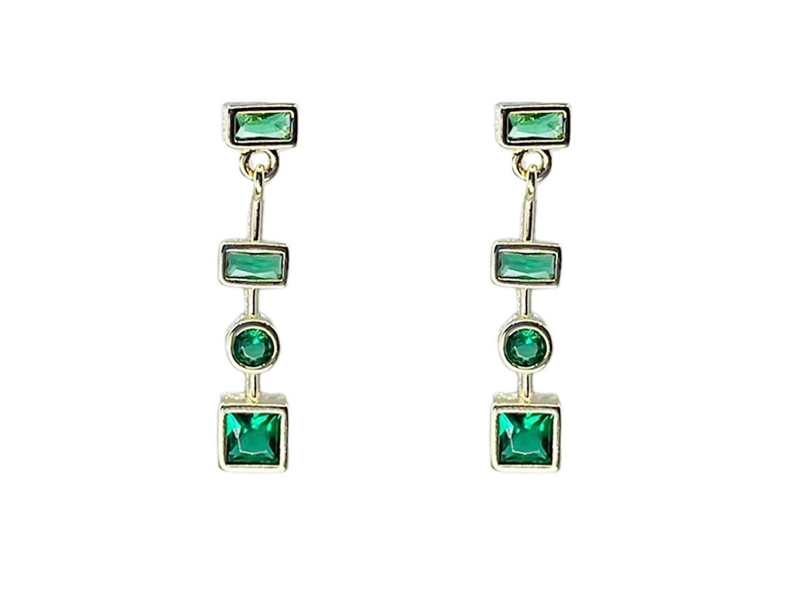 These 18k gold-filled drop earrings feature various shapes of green cubic zirconia and are 1 inch long. Nickel free. Hypoallergenic and water-resistant.