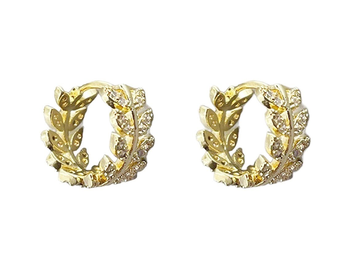 These 18k gold-filled clicker hoops offer a leaf design that's detailed with cubic zirconia. 14mm in diameter and 6mm wide. Hypoallergenic and waterproof. Handcrafted.