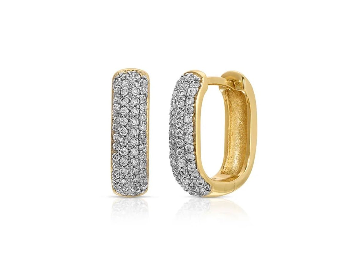 These oval hoops are made of gold plated over stainless steel and are detailed with four rows of pave cubic zirconia.