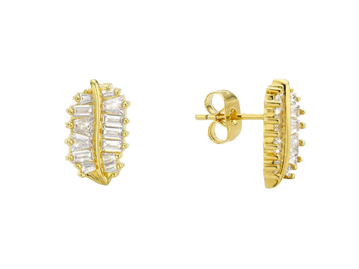 From Belgium: Made of 18k gold-plated brass, plated again with 24k gold, these leaf-patterned studs feature baguette cubic zirconia. Posts are made of gold vermeil.