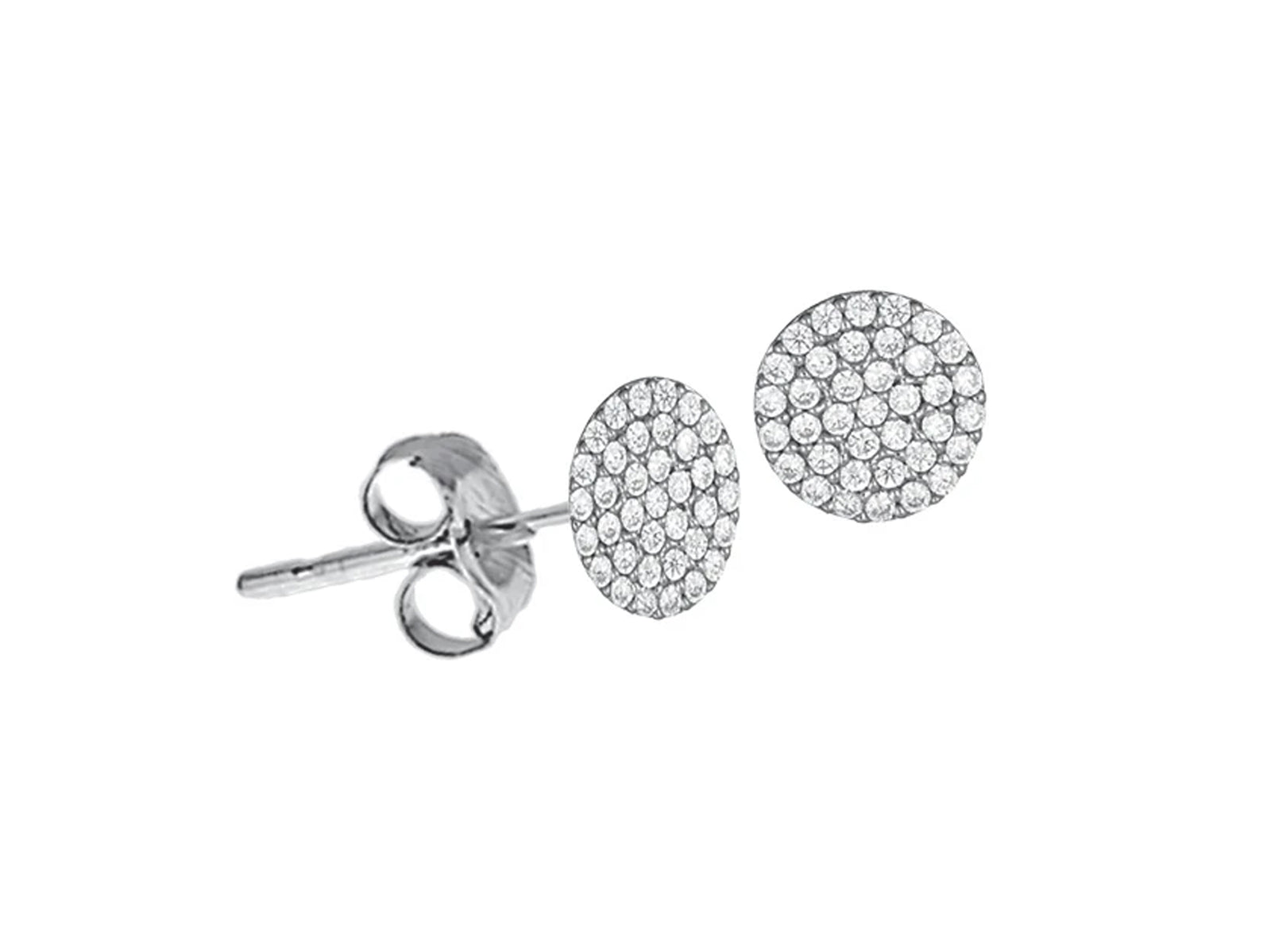 These rhodium-plated earrings feature tiny discs with pave cubic zirconia.