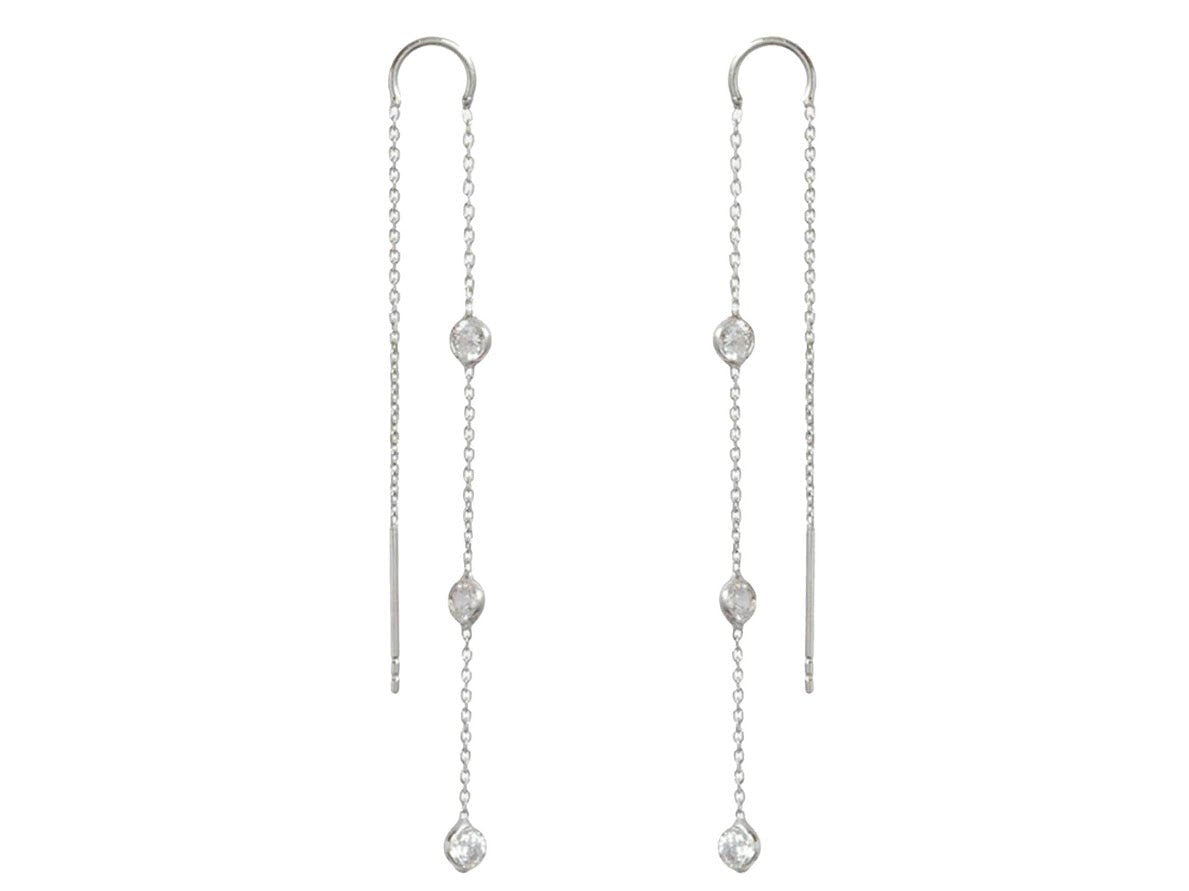 A pair of rhodium vermeil threader earrings with three bezel-set cubic zirconia.