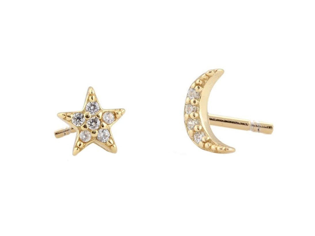 Made of 18k gold vermeil with cubic zirconia, these delightful earrings offer the star and the moon. Each stud is approximately .25 inch wide.
