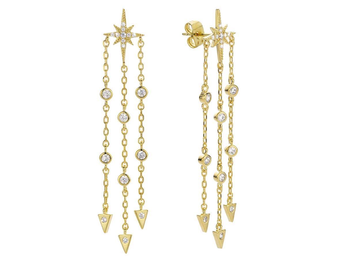From Belgium: Made of 18k gold-plated brass, plated again with 24k gold, these drop earrings feature three chains that are detialed with cubic zirconia. Posts are gold vermeil. 53mm long.