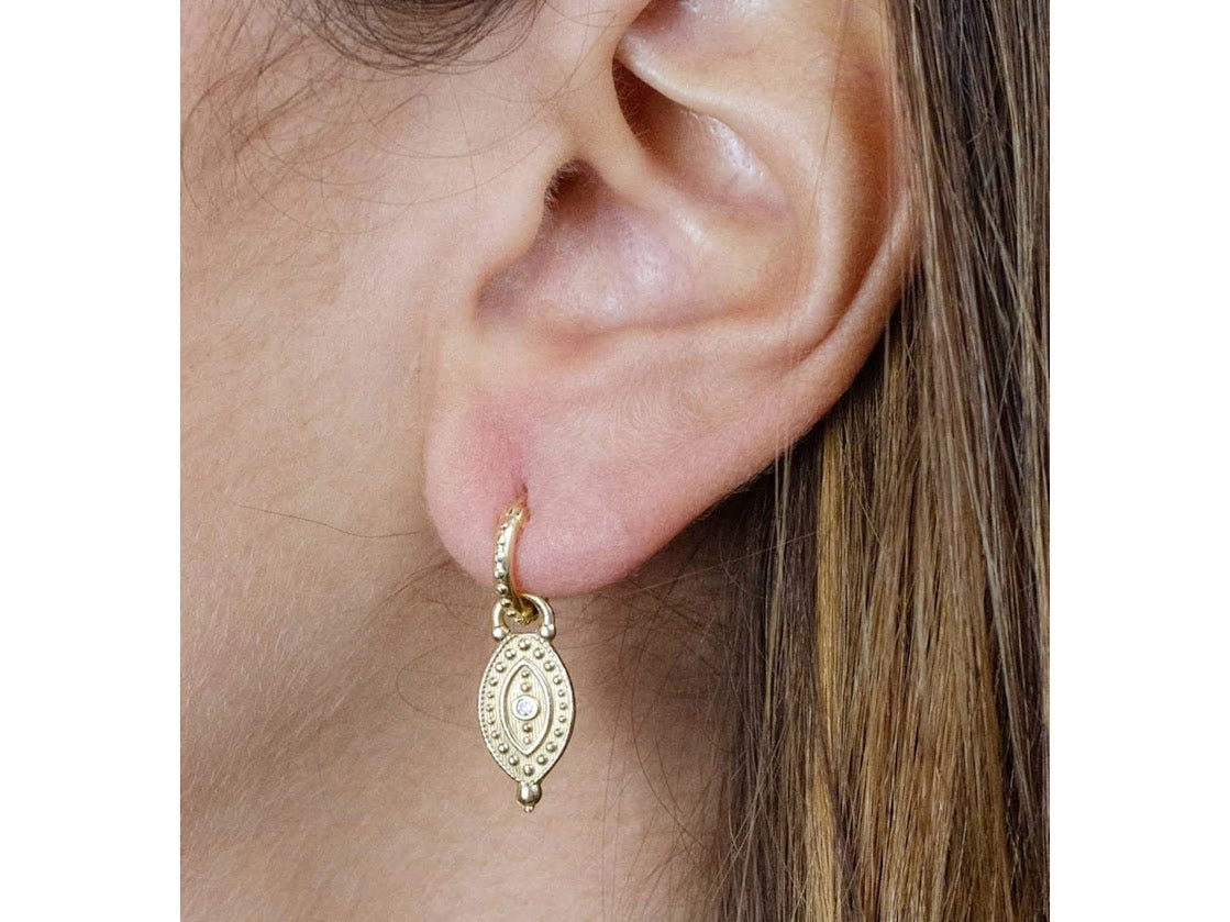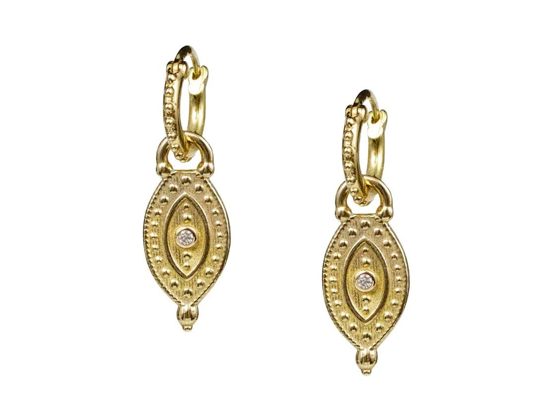 Yellow bronze ertical evil eye charms with diamond center stones hang from 18k gold vermeil beaded click hoops. Charms measure 9mm by 20mm. Hoop diameter is 11mm. Drop is 1 inch.