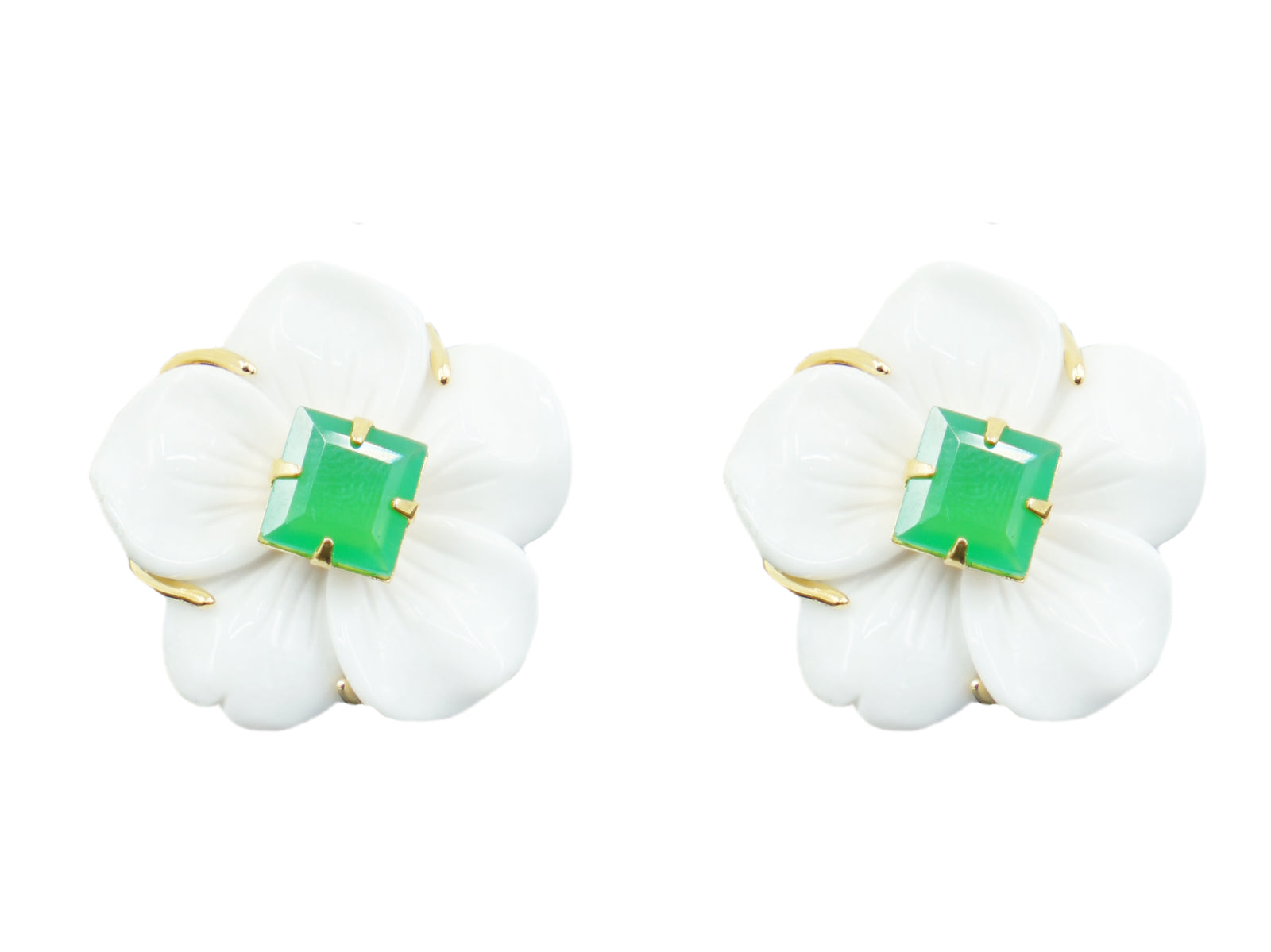 Carved white agate petals with a chrysoprase center stone in beautiful flower stud earrings that are made of 14k gold-plated brass. 7/8ths inch in diameter.