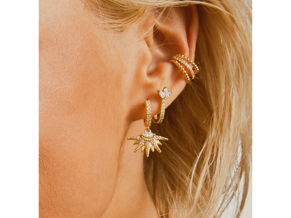 Gold Huggie Hoops with Sunrise Drop Charms