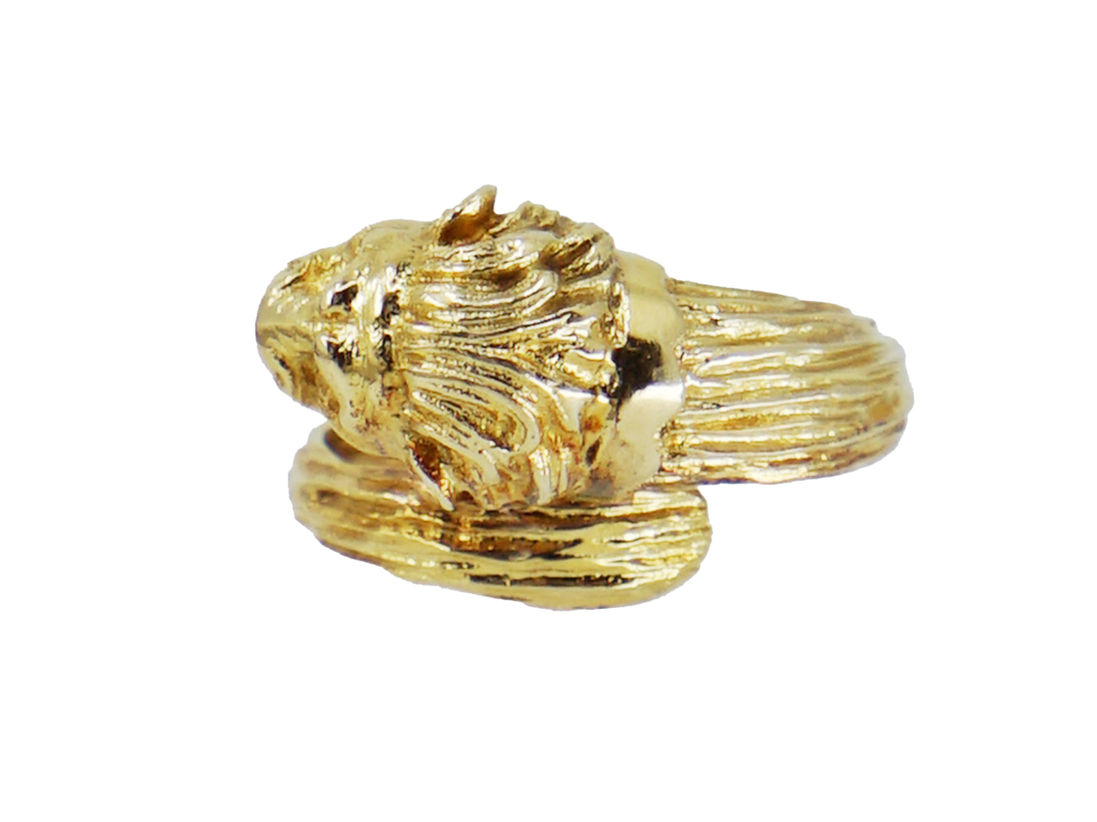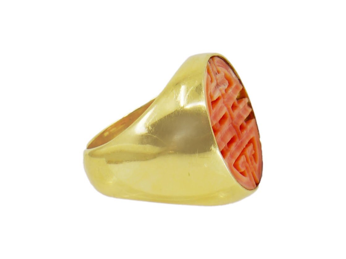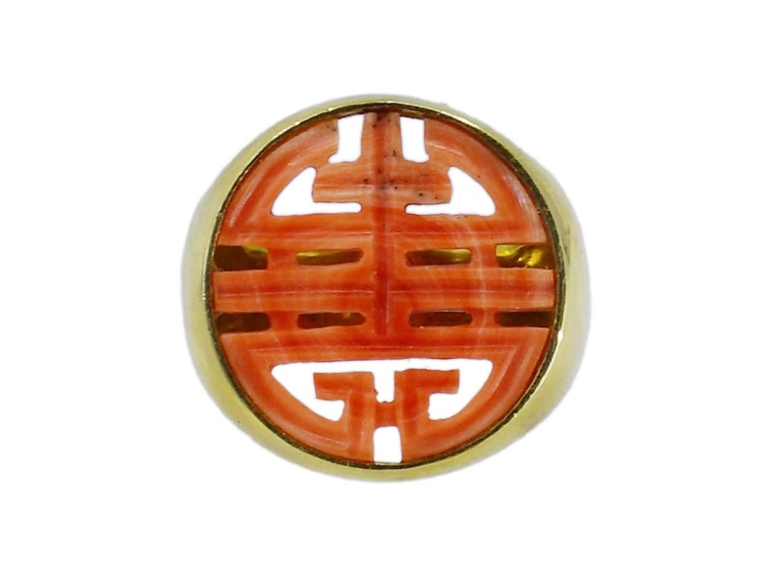 18k Yellow Gold Coral Inset Asian Motif Ring