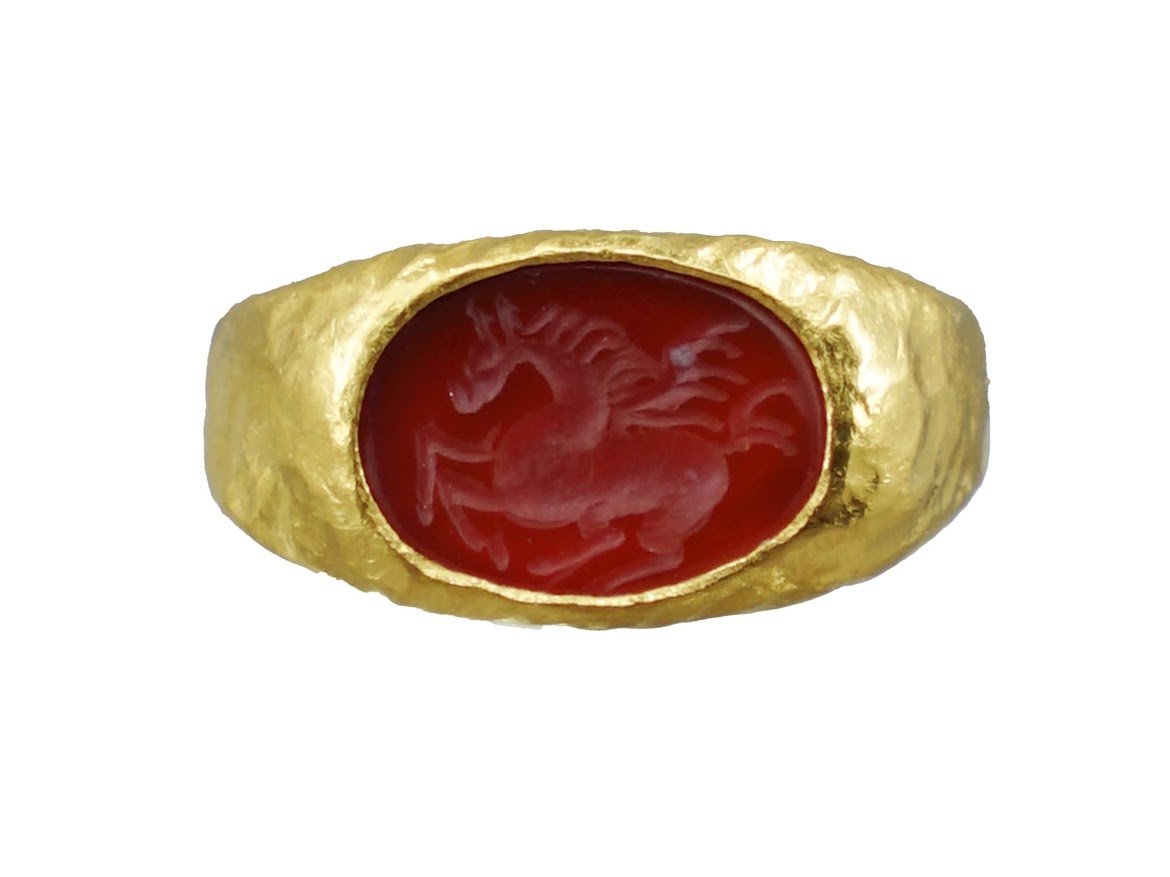 Made of 14k and 19k gold, this ancient carnelian Pegasus intaglio ring is a size 6 and can be re-sized.