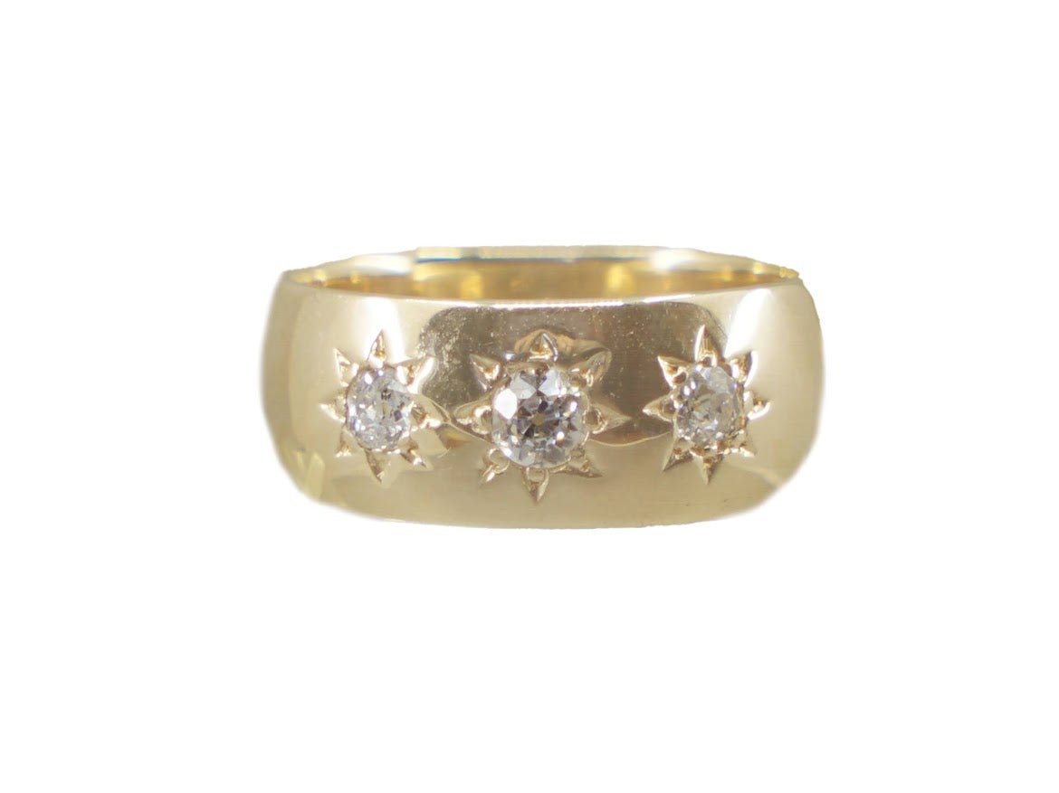 This mid-century celestial star ring, made of 14k yellow gold, features .60pts of diamonds. Size 8 and can be re-sized.