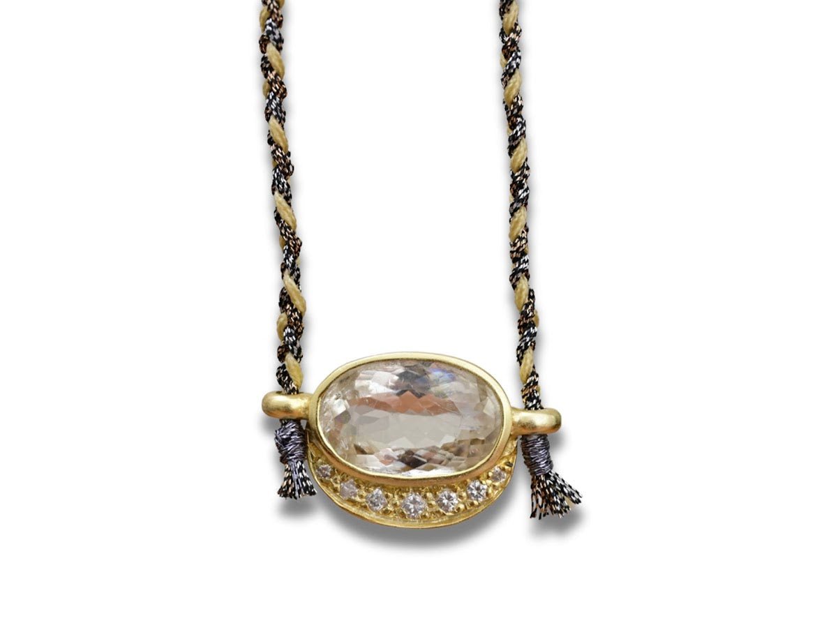 A 10k yellow gold charm with a faceted amethyst that's approximately 5ct, plus diamonds, hangs from a black, white and yellow hand-braided silk cord.