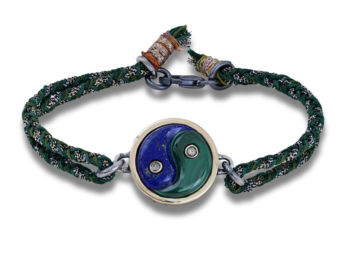 10k/SS Lapis and Malachite Yin Yang Bracelet with Diamonds on Silk