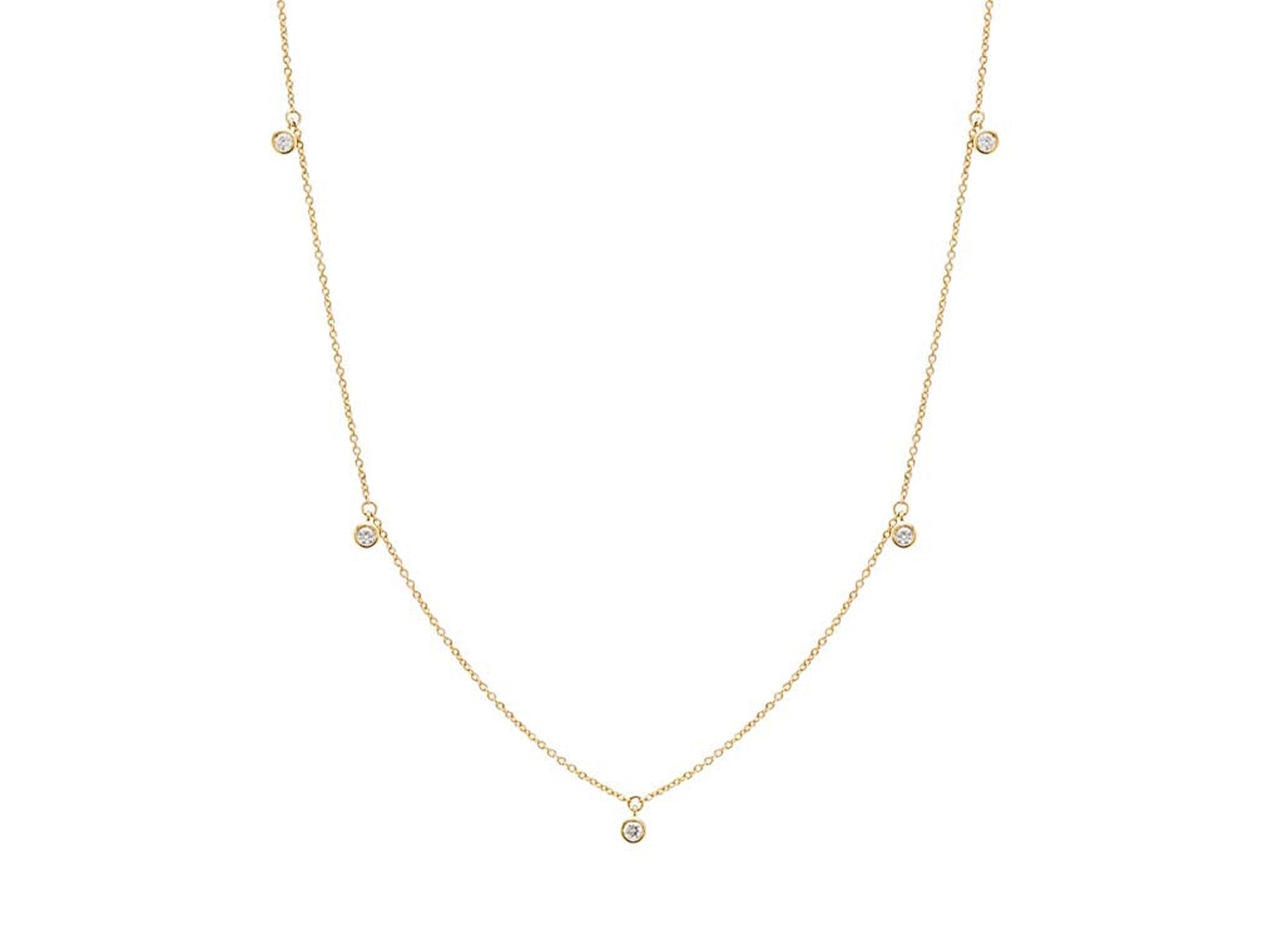 This 14k yellow gold necklace features five round bezel-set diamonds of .10ct. 16 inches long plus a 2-inch extender.