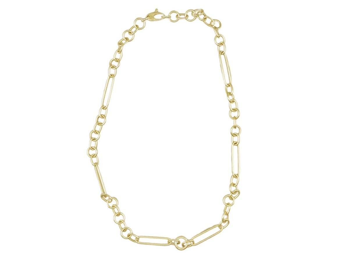This 14k yellow gold chain is made of a pattern of 5 round and 1 oval links, all 1mm thick. 18 inches long. Lobster clasp and a connector clasp for easy charm add. This is a special order item. Please allow an additional two weeks for delivery.