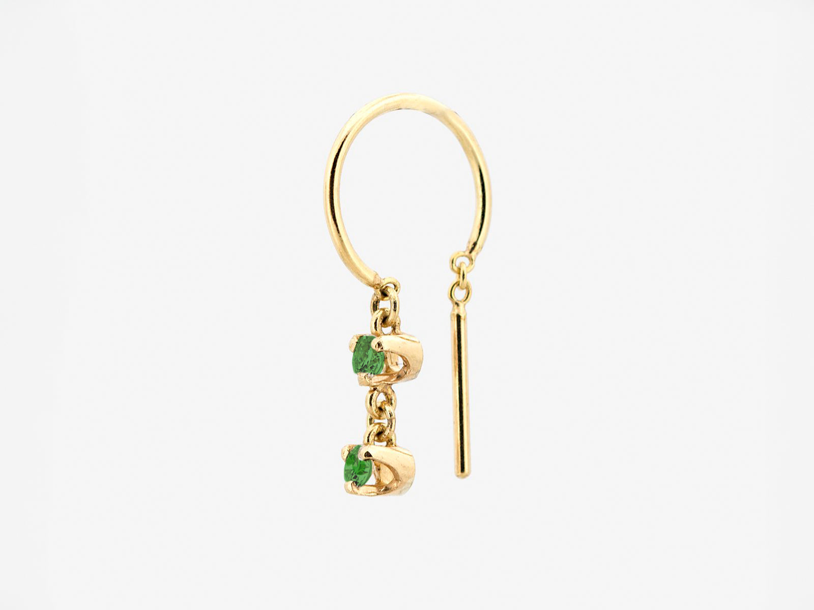 This 14k yellow gold threader-style earring offers two dangling columns and two 2mm prong-set emeralds. Sold as a single.