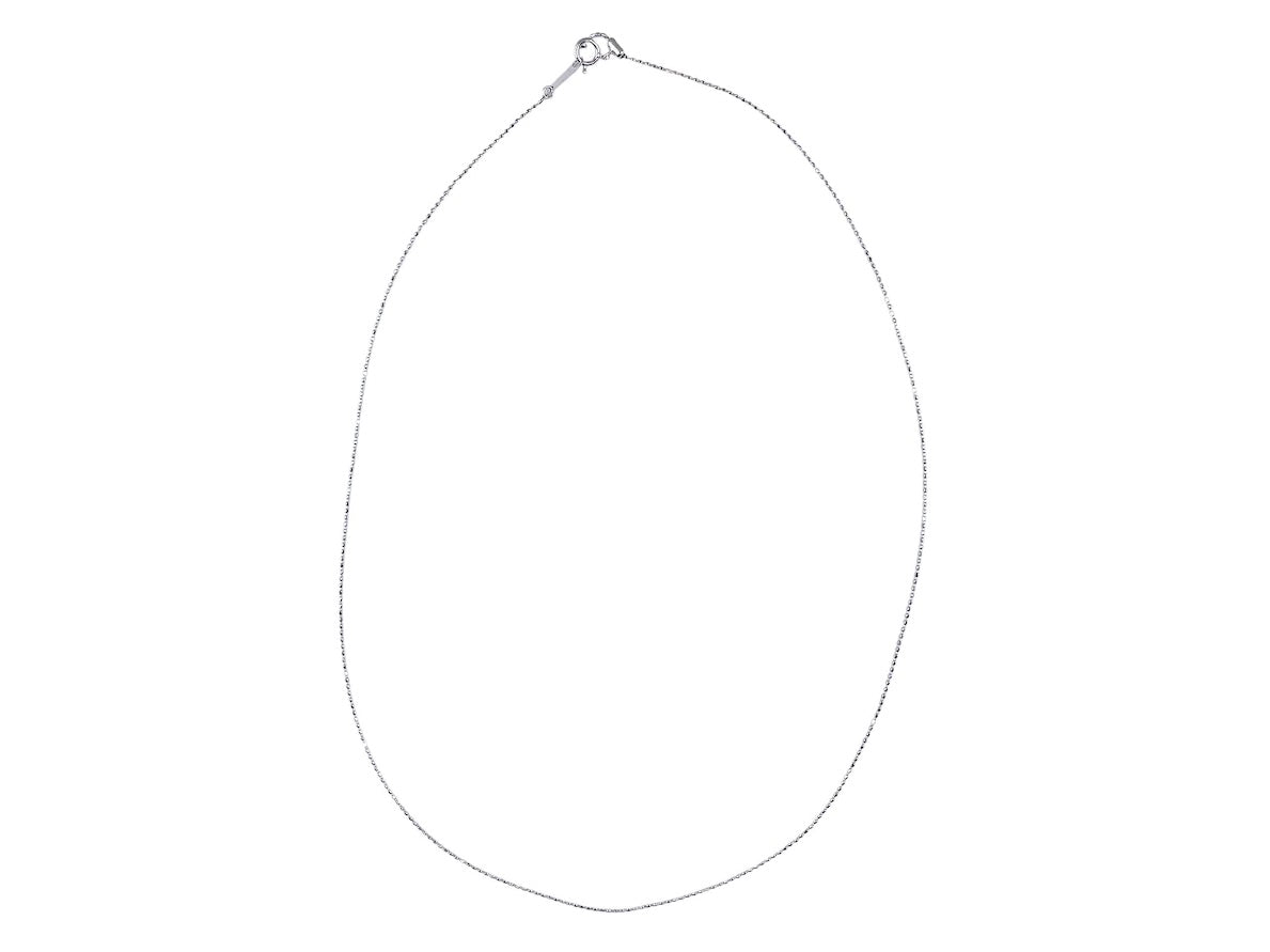 Made of 18k white gold, this dotted chain measures 18 inches and features an adjustable pull tie with a spring ring clasp.