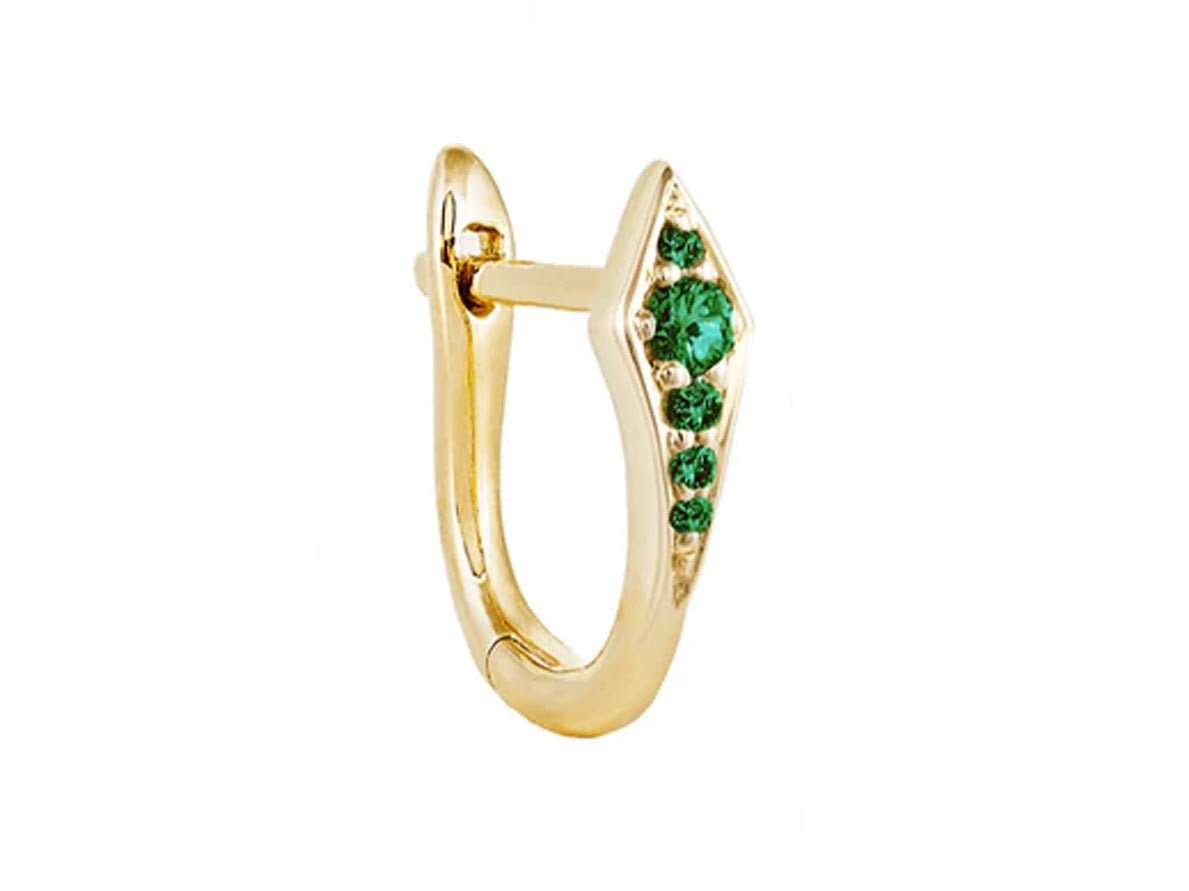 Made of 9k yellow gold, these pointed huggie hoops features five emeralds that measure approximately .8 to 1.8mm. Length is 11.5mm. Ear post and lever back clasp.