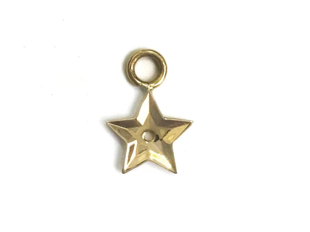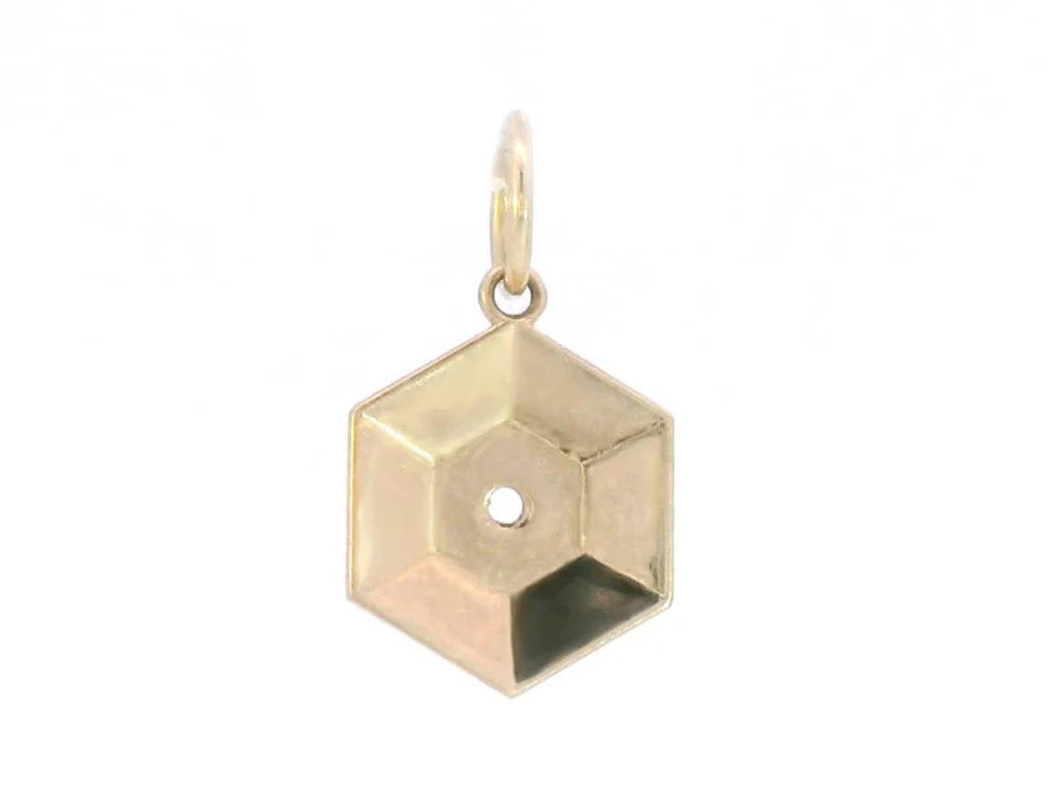 Made of 9k yellow gold, this long point rhombus charm features graduated emeralds that measure 1.4mm, 1.2mm, 1.1mm, .9mm, and .8mm. Charm measures 11.5mm by 3mm, plus a 3mm loop.