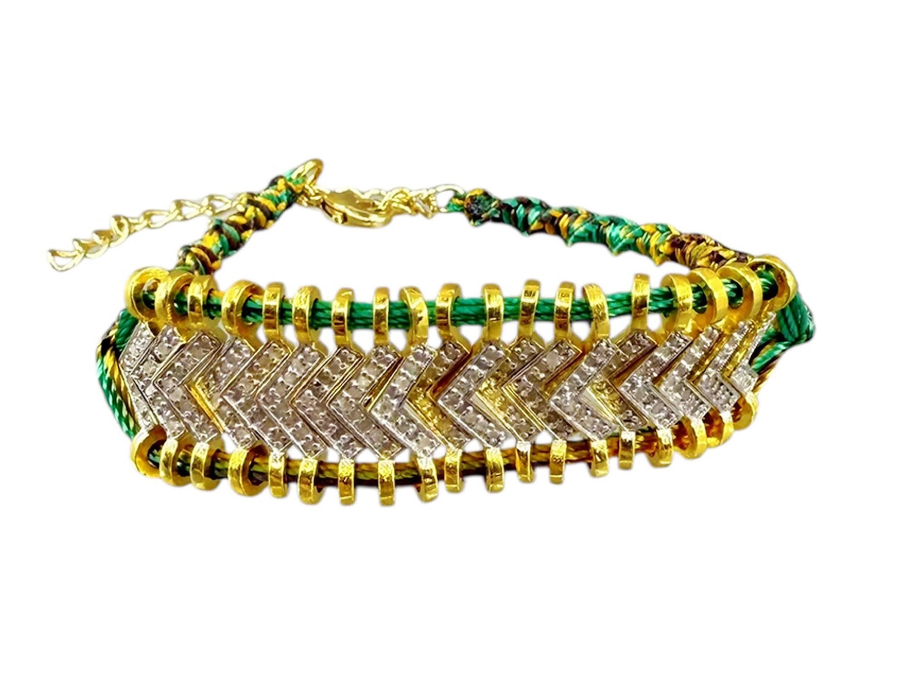 A row of diamond arrows on a gold vermeil bar with a woven green cord. 1.5cm wide. Adjustable from 17cm to 20cm. Made in France.