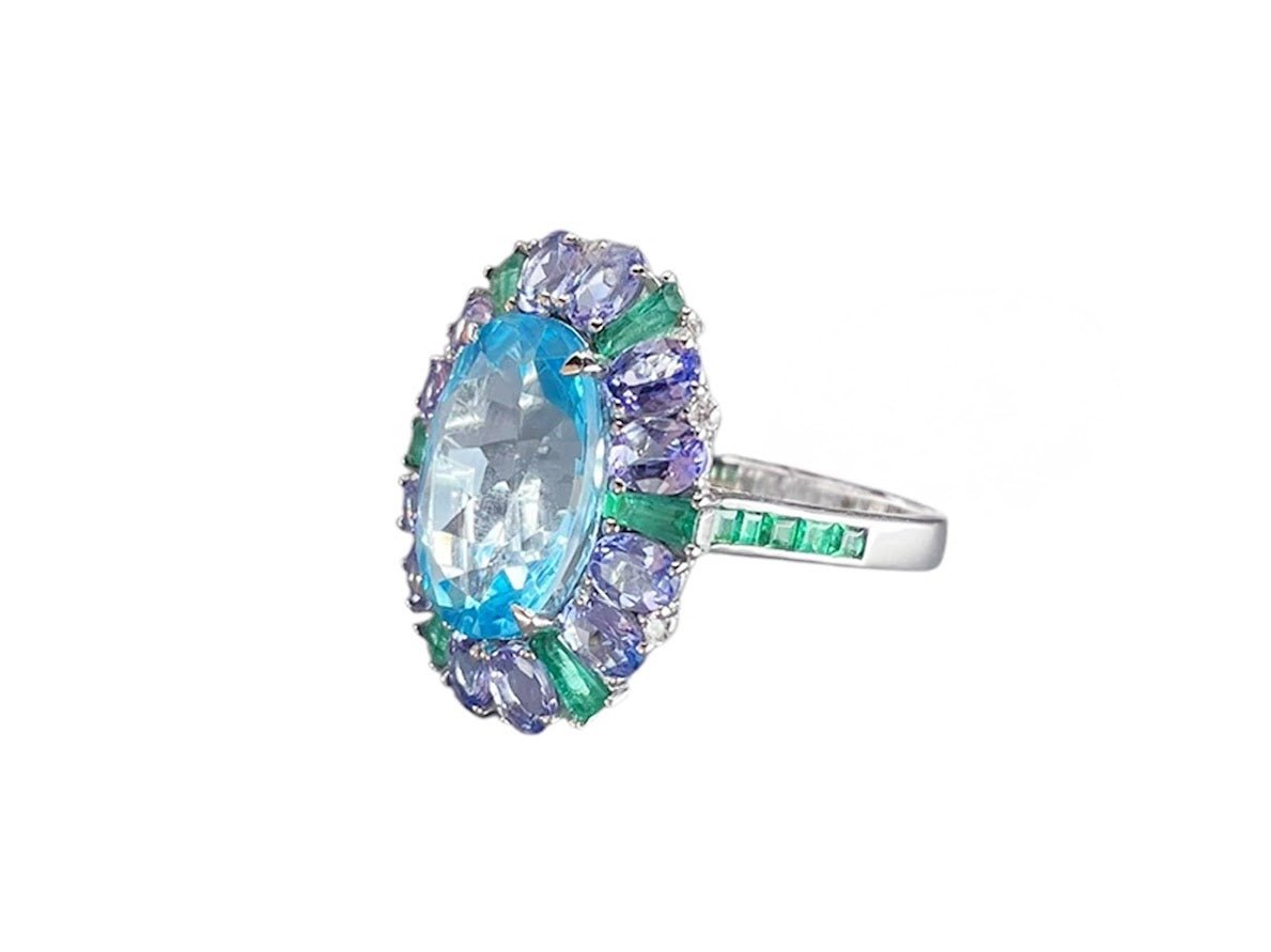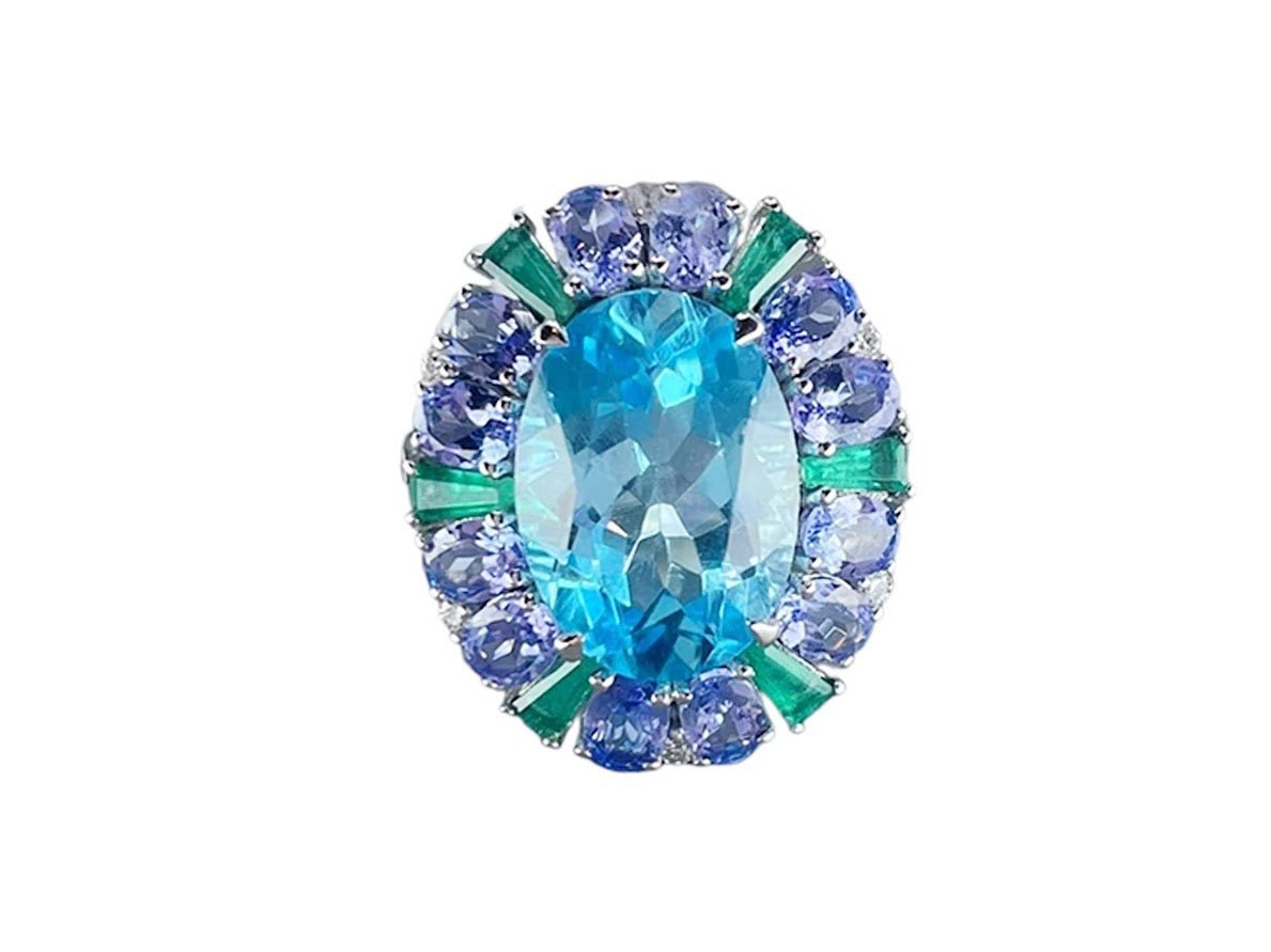 18k Cocktail Ring with Emerald, Tanzanite, Blue Topaz, and Diamond