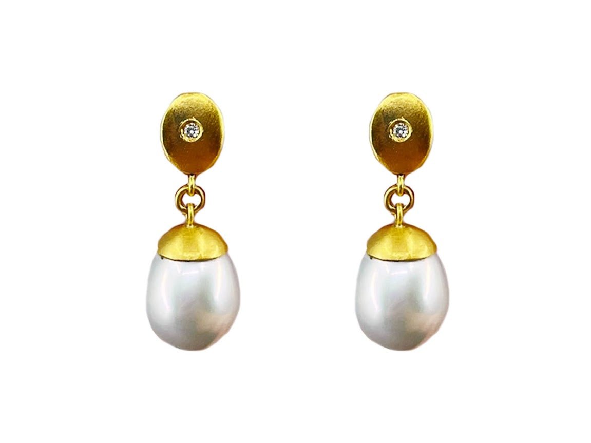 24k YG and SS Gray Pearl and Diamond Drop Earrings