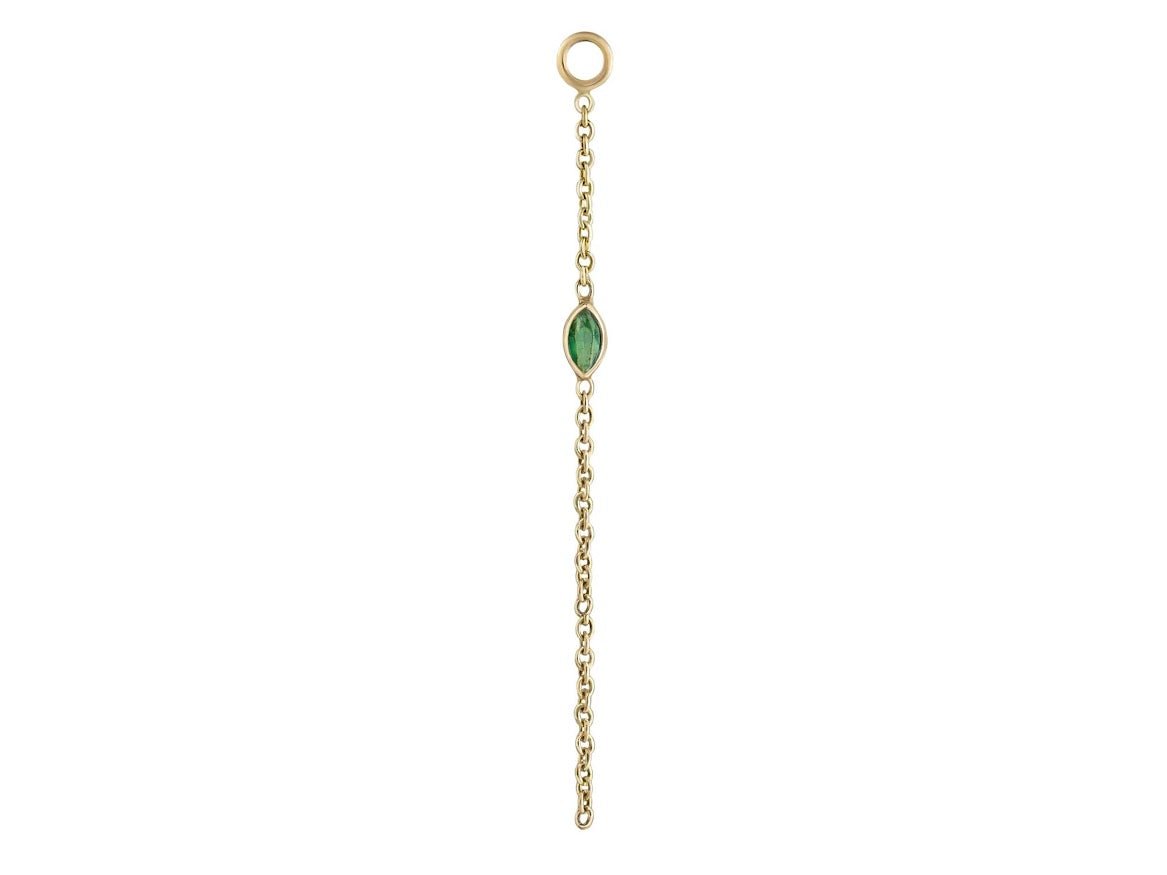 Made of 9k yellow gold and a marquis emerald that measures 1.5mm by 3mm, this chain drop charm measures 40mm plus a 3mm loop.