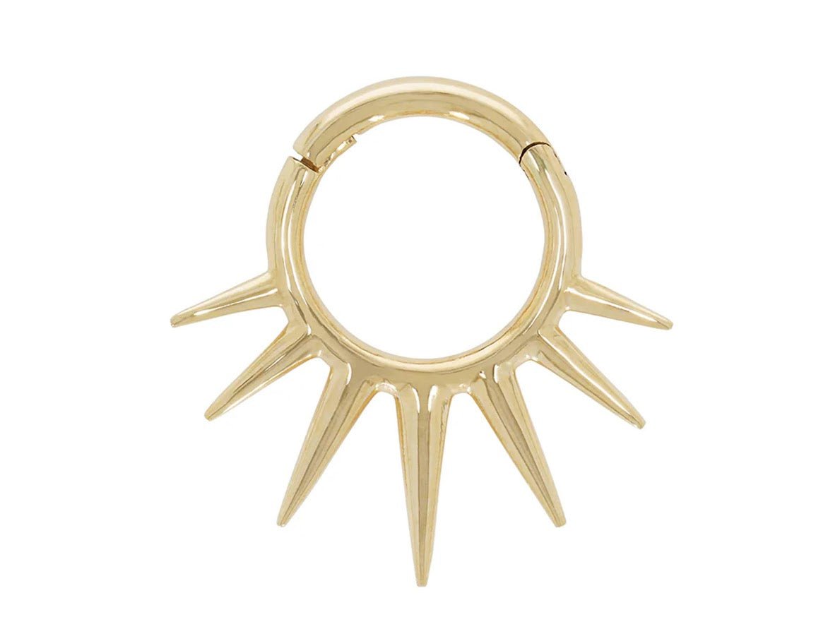 Made of 9k yellow gold, this dramatic hoop come in two size. Small is 7.5mm inner diameter and 9.9mm outer diameter with a point length of 2.8 to 5.8mm. Large is 9.5mm inner diameter and 11.9mm outer diameter with a point length of 2.8 to 5.5mm.