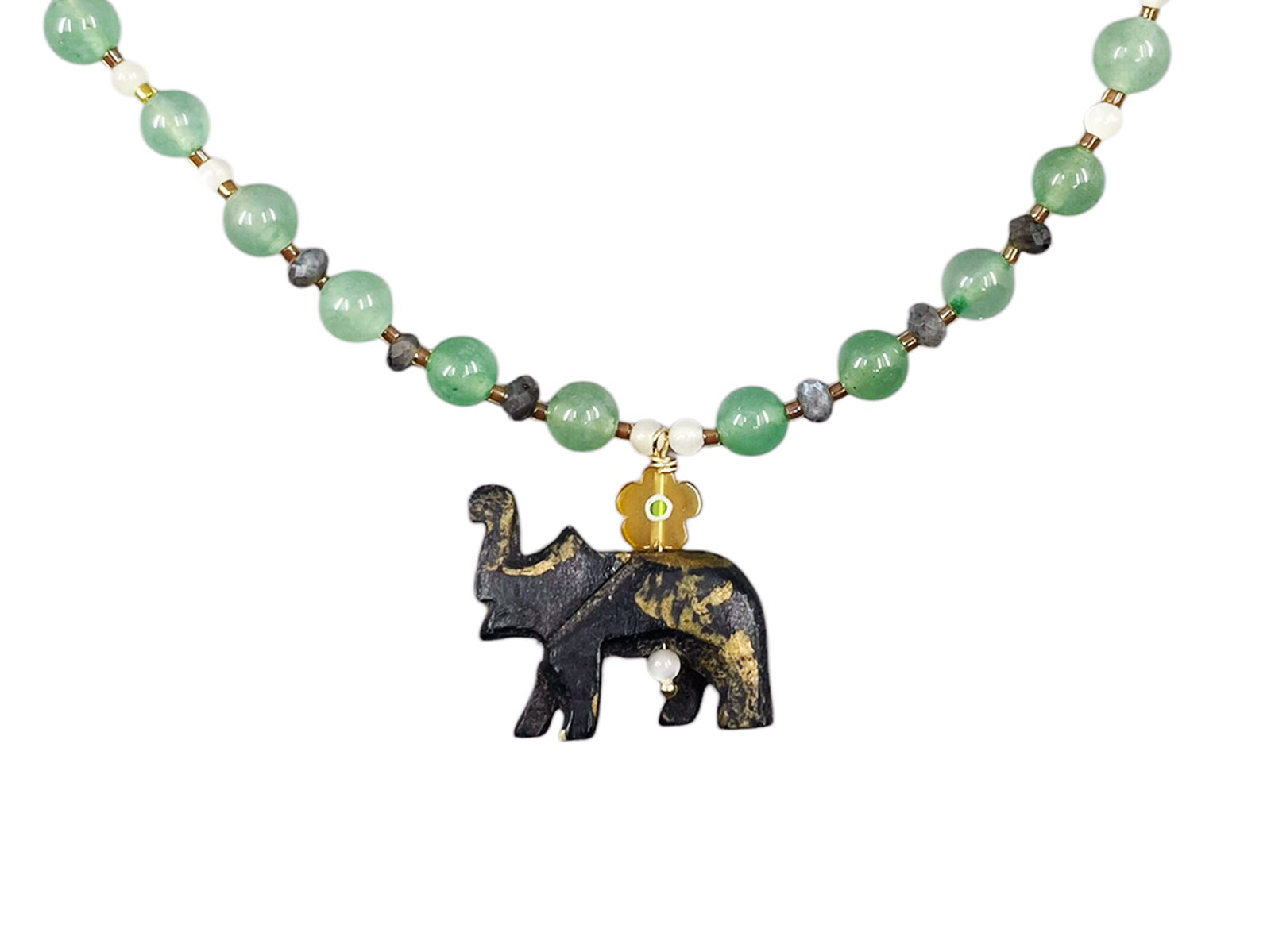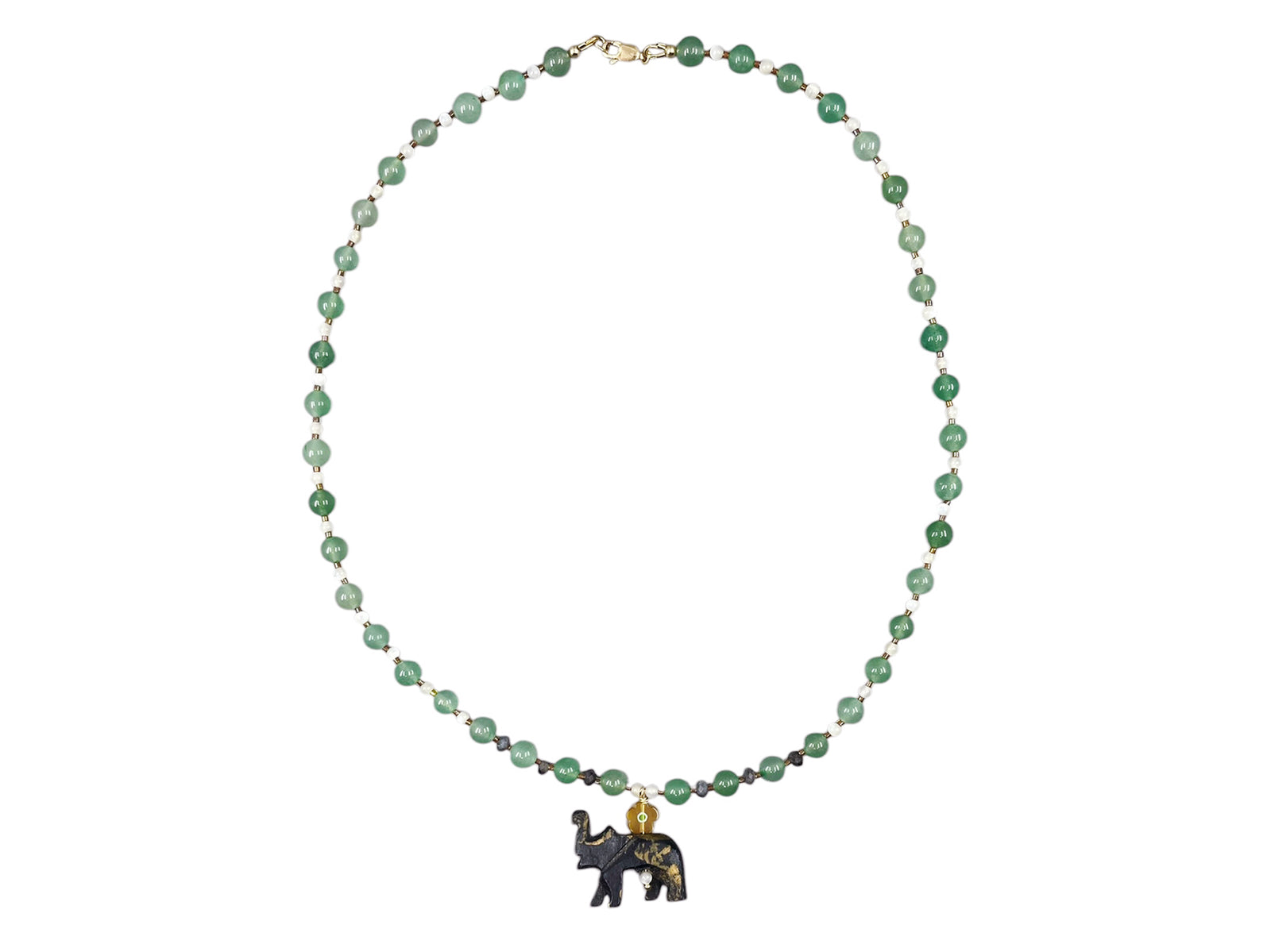 MOP and Aventurine Bead Necklace with MOP Heart, Bird, and PEACE