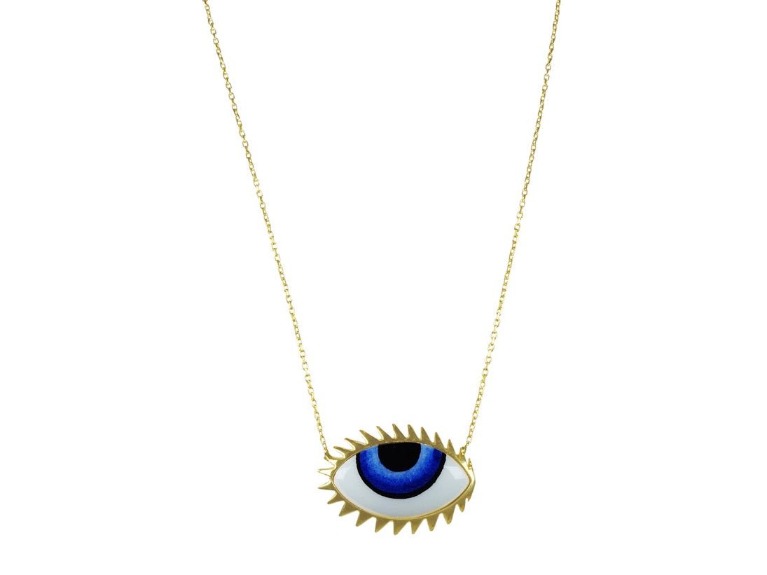 Handpainted Ceramic Blue Evil Eye Necklace w/ Gold Eyelashes