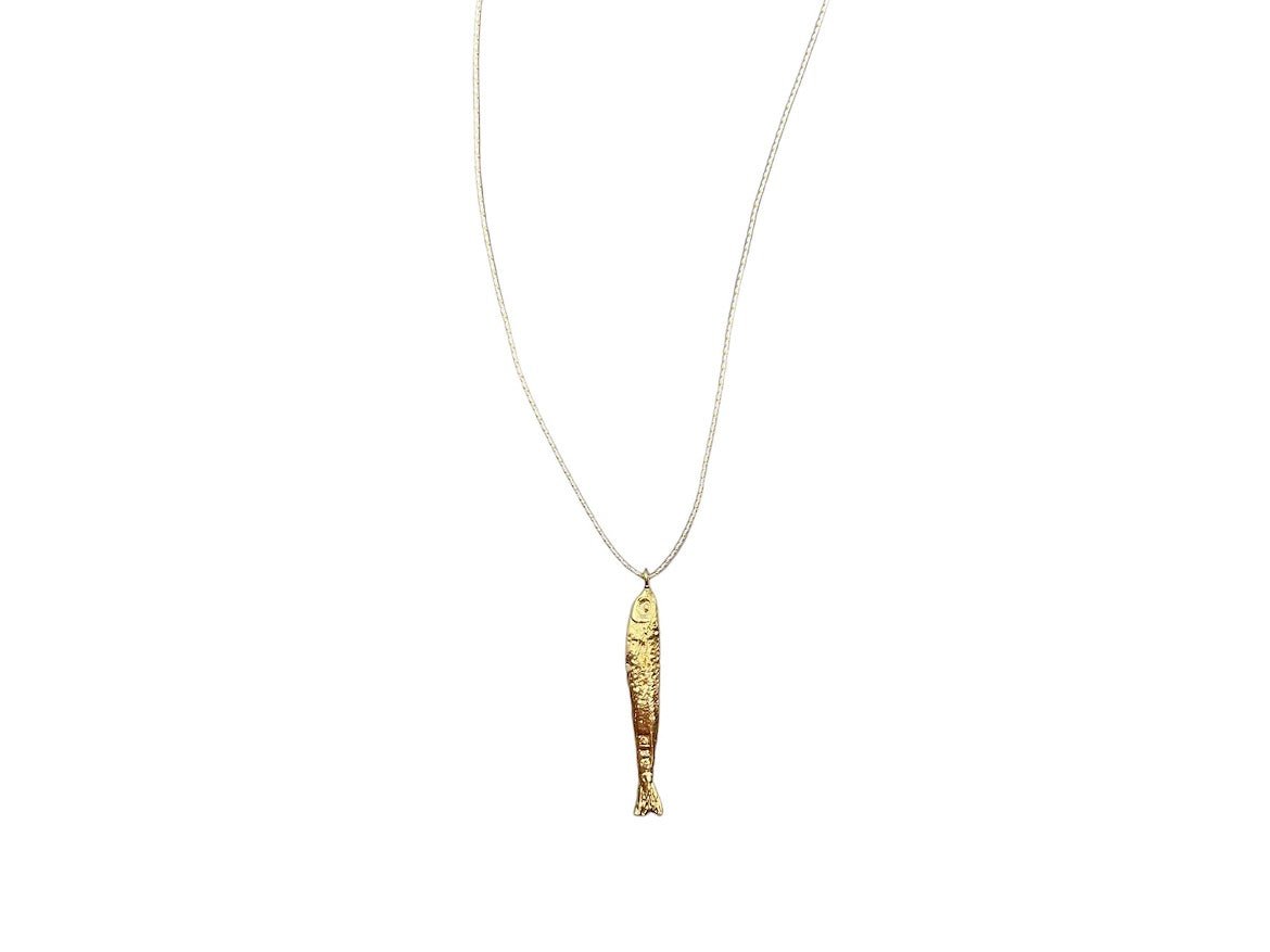 A 40mm gold-plated fish charm hangs from a gold lurex thread with a sliding knot closure.