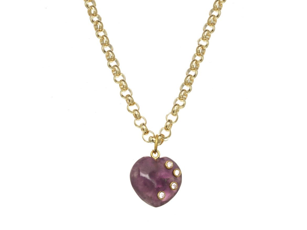 A puffy amethyst heart charm, detailed with cubic zirconia, hangs from a 14k gold-plated rolo chain that's adjustable from 16 to 18 inches. Hearts hangs 1 inch long.