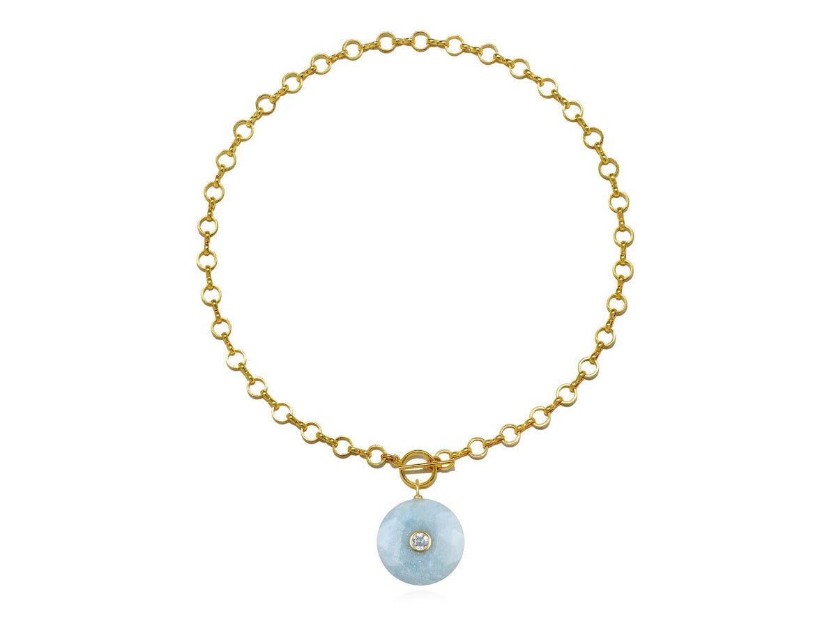 A faceted aquamarine charm with a white topaz center stone set in 14k gold vermeil measures 25mm and hangs from a 14k gold-plated petitie loop chain with a 14k gold-filled toggle front closure. 18 inches long.