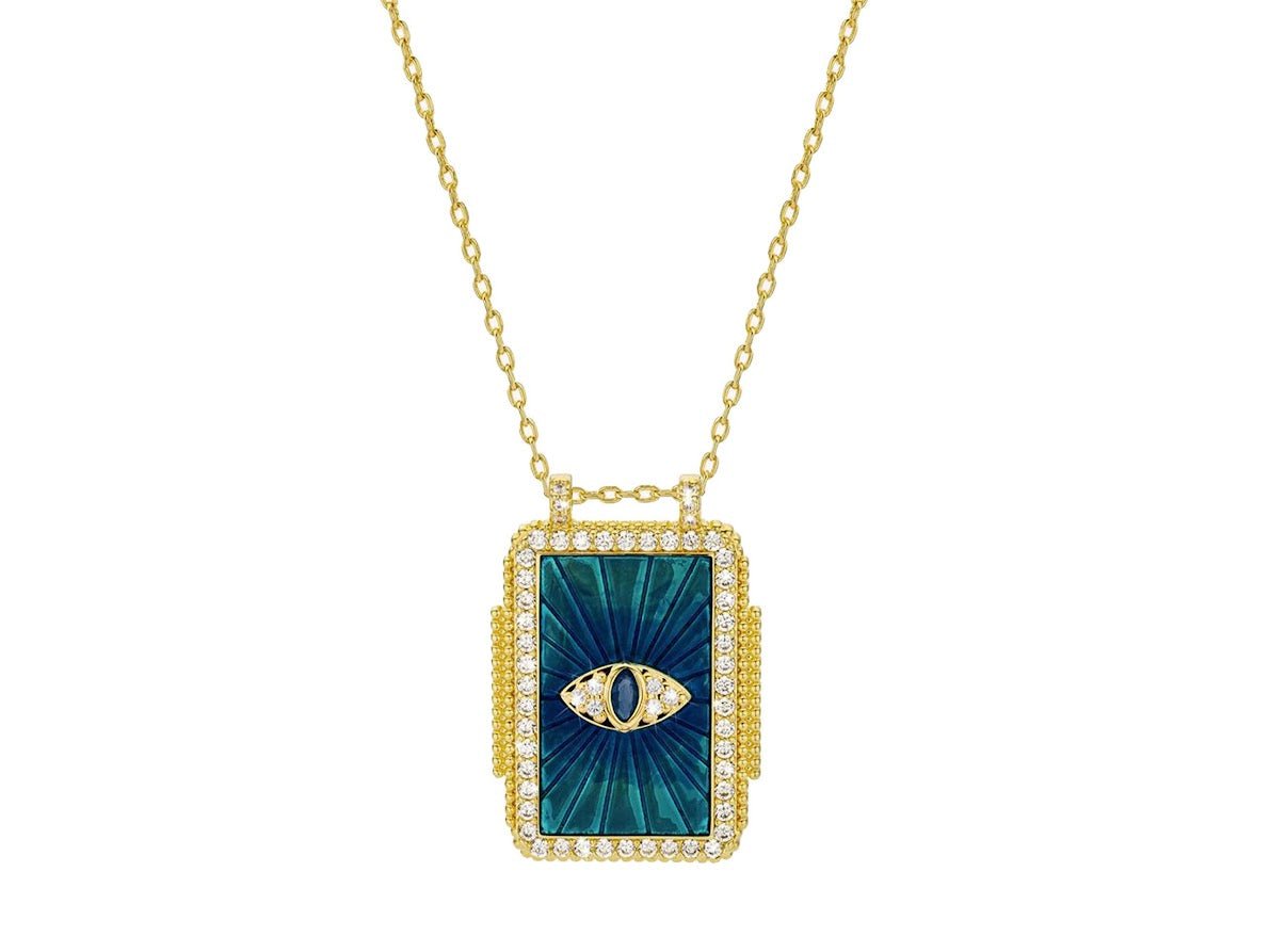 From Belgium: Made of 18k gold-plated brass, plated again with 24k gold, this 45cm to 53cm necklace features a blue evil eye pendant detailed with enamel and cubic zirconia.