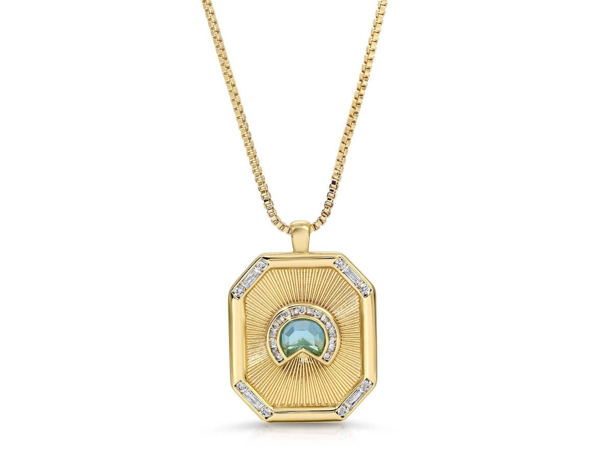 This 14k gold-plated necklace features a texture retangular charm that features a hand-cut and died natural crystal quartz stone with cubic zirconia baguettes. Charm measures 22mm by 26mm. Box chain is 16 inches long with a 2-inch extender.