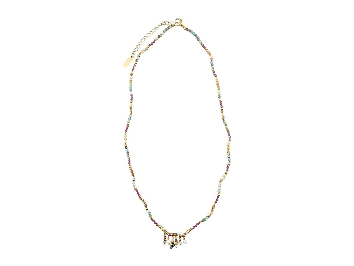 An adjustable brown beaded necklace, with gold-plated components, features numerous delicate stone charms. Necklace is adjustable from 15.5 to 17.5 inches.