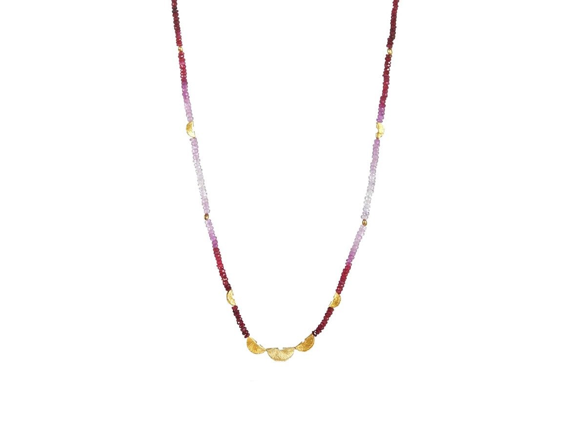 Burmese ruby beads, combined with gold-filled half-moon beads, in a necklace that's adjustable from 16 to 18 inches.