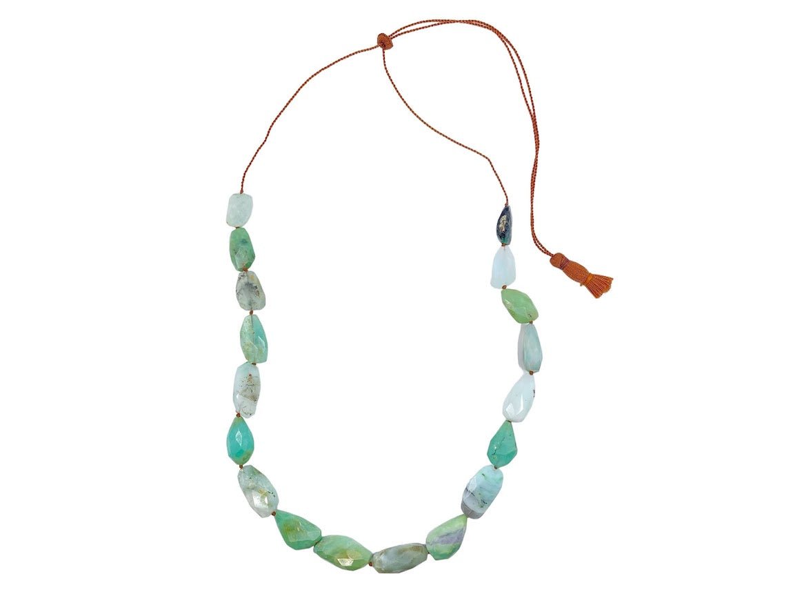 A strand of chunky chyrsoprase stones are hand-knotted on brown silk with an adjustable length and a finishing tassel.