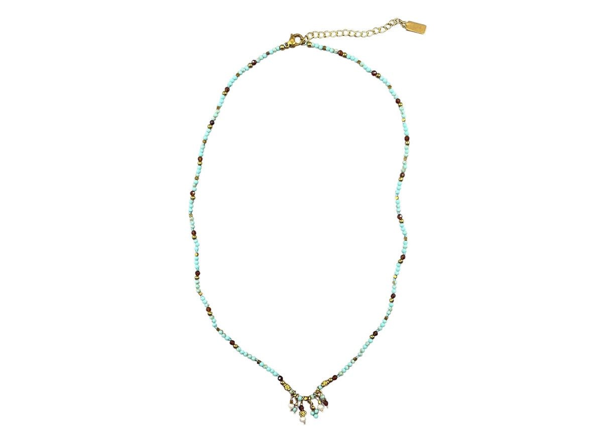 An adjustable necklace of turquoise, gold, and brown delicate stones with five tiny charms. Great alone or with your other favorites.