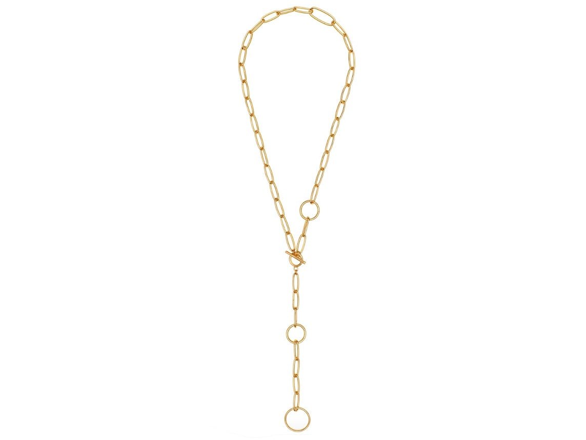 An 18k gold-plated drop chain necklace with a chain length of 17 inches and a drop length of 5.5 inches.