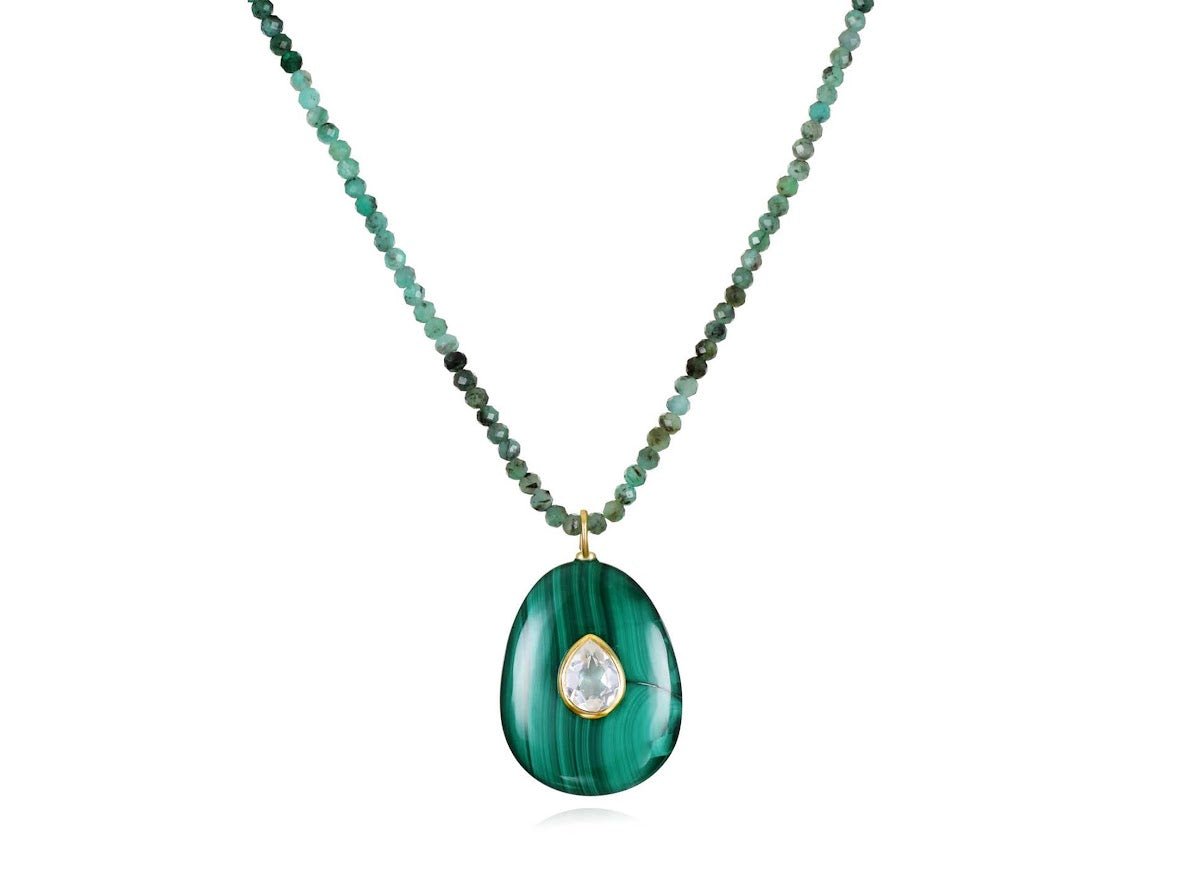 A necklace of emerald beads features a malachite charm that's inset with 14k gold vermeil and white topaz center stone. Charm measures 21mm by 28mm.