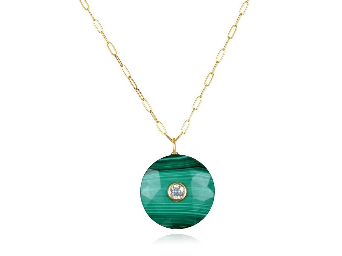 A 14k gold vermeil and faceted malachite charm with a white topaz center stone hangs from a 14k gold-filled paperclip chain. Charm measures 25mm. Chain is adjustable from 16 to 18 inches.