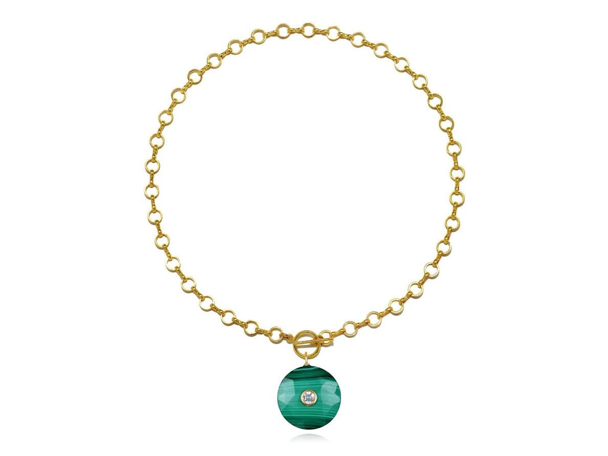 A faceted malachite coin pendant with a 14k gold vermeil and bezel-set white topaz center stone measures 25mm in diameter and hangs from a 14k gold-plated petite loop chain with a 14k gold-filled toggle front closure. Chain is 18 inches long.