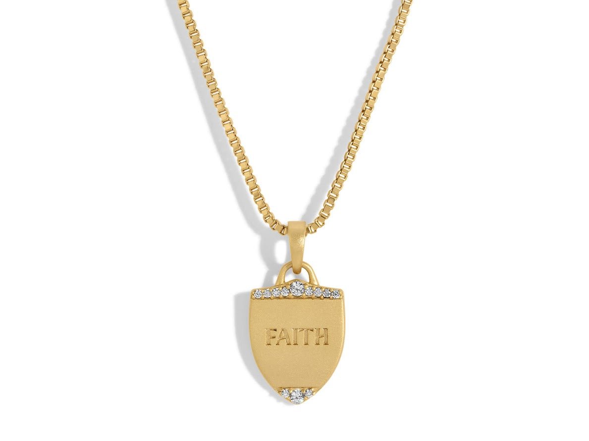 This 18k gold-plated necklace features a shield charm that's detailed with cubic zirconia around the word "FAITH."