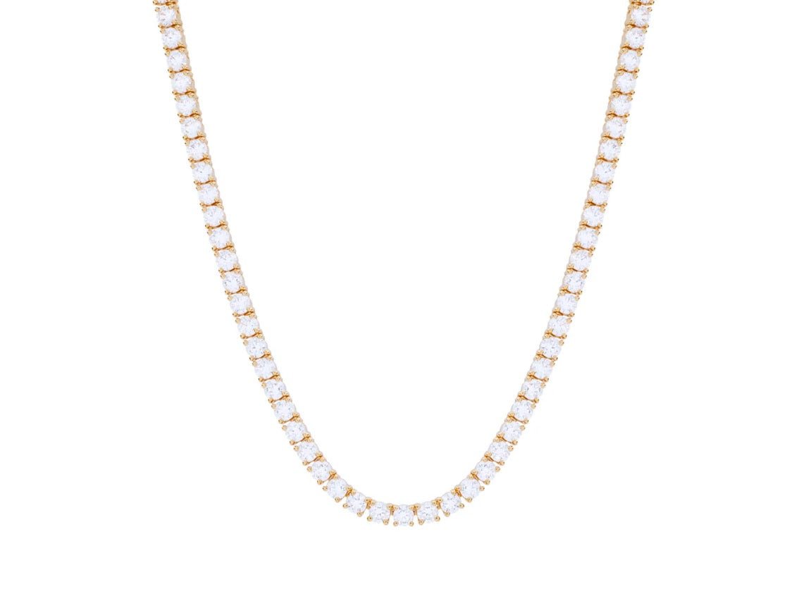 This gold-plated tennis necklace features 4mm cubic zirconia stones. 16 inches long. Perfect on its own, or as part of your neck stack.