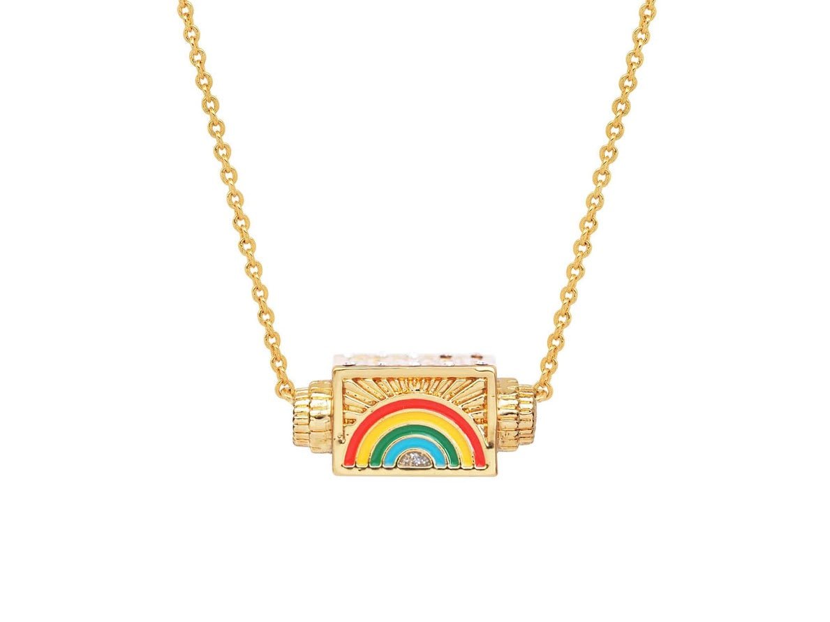 This gold-plated necklace features a spinner charm that spells out A Little Bit of Magic, along with rainbow imagery. Adjustable from 16" to 18".