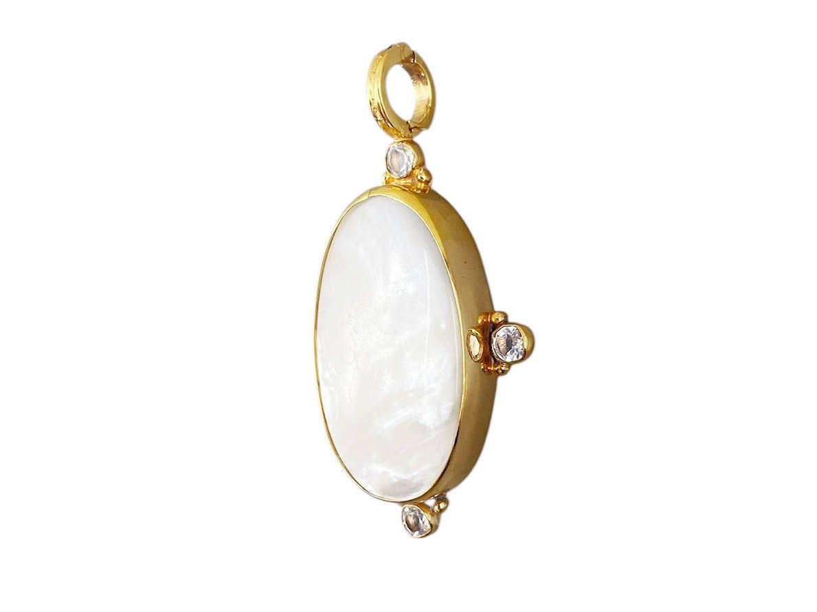 An 18k gold vermeil charm with an oval mother-of-pearl center stone that features a white topaz stone on each side. The bail opens so it can be placed on your favorite chain.