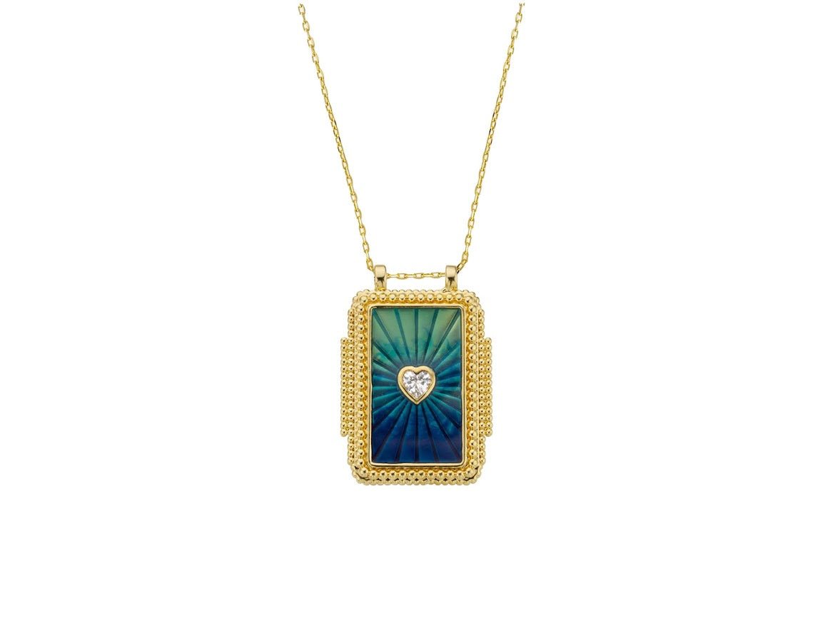 From Belgium: Made of 18k gold-plated brass, plated again with 24k gold, this heart pendant is detailed with ombre enamel and cubic zirconia. On the reverse, it says "Ibiza is not a destination It's a way of life" is spelled out on a rayed background. Charm hangs from a chain that's adjustable from 45cm to 53cm.